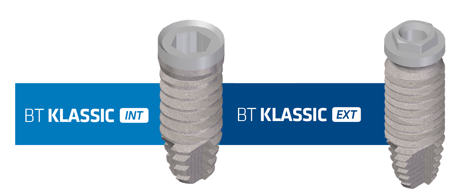 IMPIANTO BT KLASSIC • Impianto con nocciolo cilindrico • Design a quattro taglienti apicali • Proprietà autofilettanti • Disponibile con connessione ad esagono interno e ad esagono esterno |